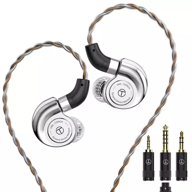 TRN CONCH es un IEM con driver dinámico y carcasa metálica, pensado para un sonido sólido y fácil de amplificar gracias a sus 30 Ω de impedancia y 114 dB de sensibilidad. Viene con un kit muy completo para personalizar ajuste y firma sonora, incluyendo varias puntas, boquillas de afinación y conectores intercambiables para adaptarse a distintas salidas.